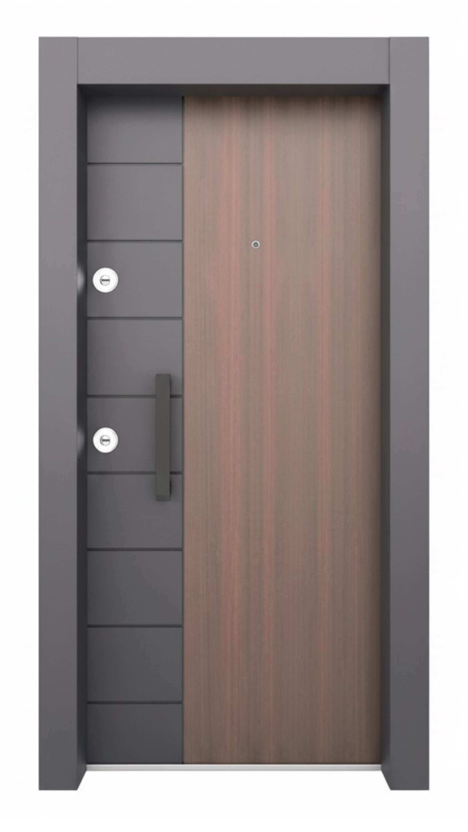 باب خارجي مصفّح – مقاس قياسي 115×220 سم – طلاء مقاوم للصدأ مع خشب لامينوكس الفاخر